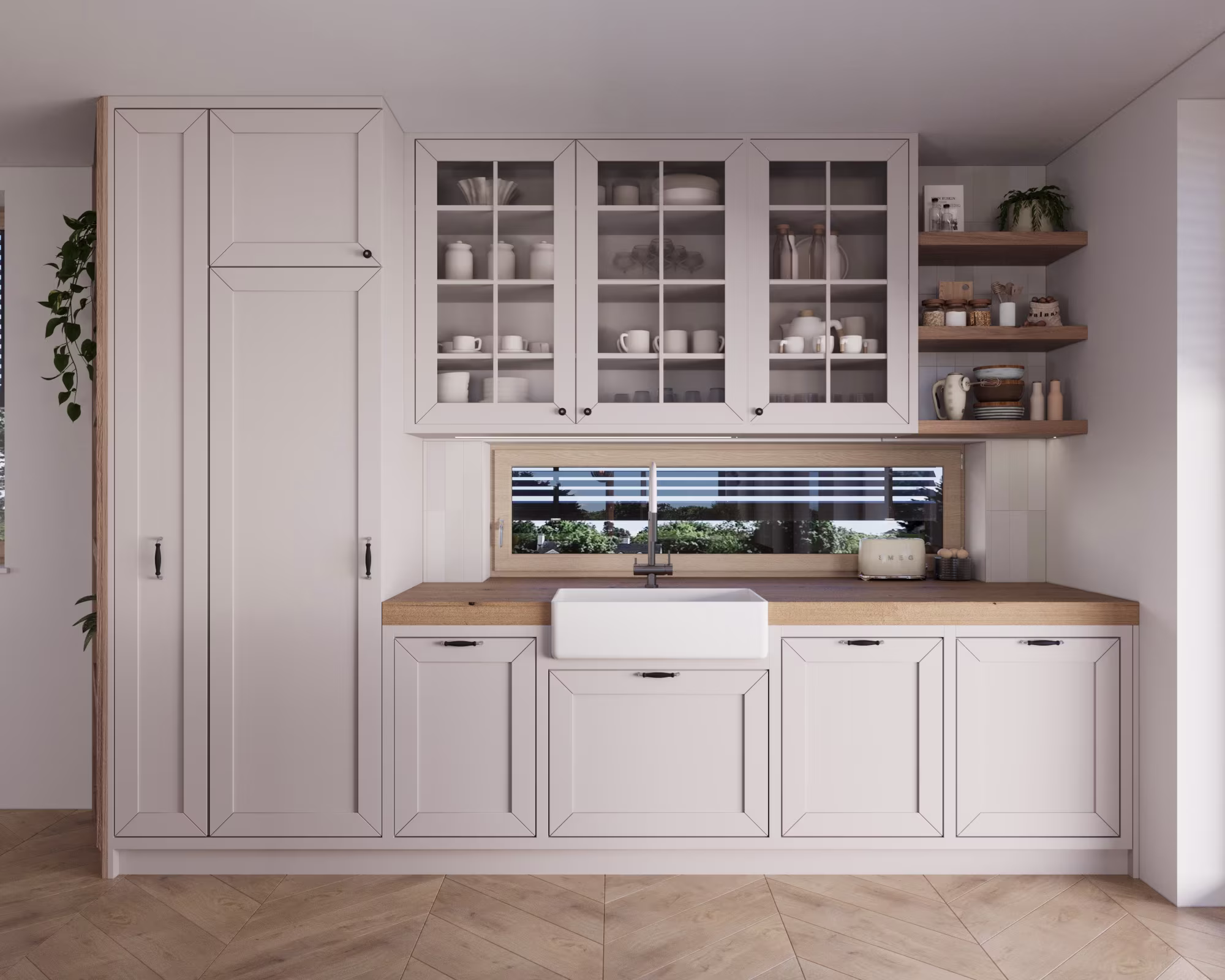 Preberi večUmirjen interier s toplimi lesenimi površinami, nežnimi bež toni in prepoznavno kuhinjo, ki združuje estetiko, udobje in harmonijo doma.