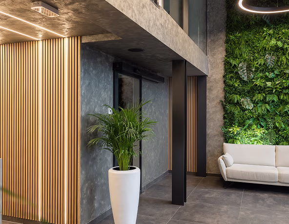 Les, zelenje, kovina in beton so bili osnovno vodilo pri oblikovanju recepcije in skupnih prostorov. Surovi železni profili in stene v videzu betona dajejo značilen industrijski videz, ki smo ga omehčali z zeleno steno, rastlinami in lesenimi letvicami.